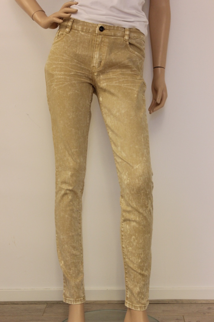 2015003 - Oker skinny jeans van 10Feet jeansmaat 29 (valt als maar 36/38). De broek sluit met een rits en een knoop voor, heeft twee insteekzakken voor en twee achterzakken. De broek heeft stretch.