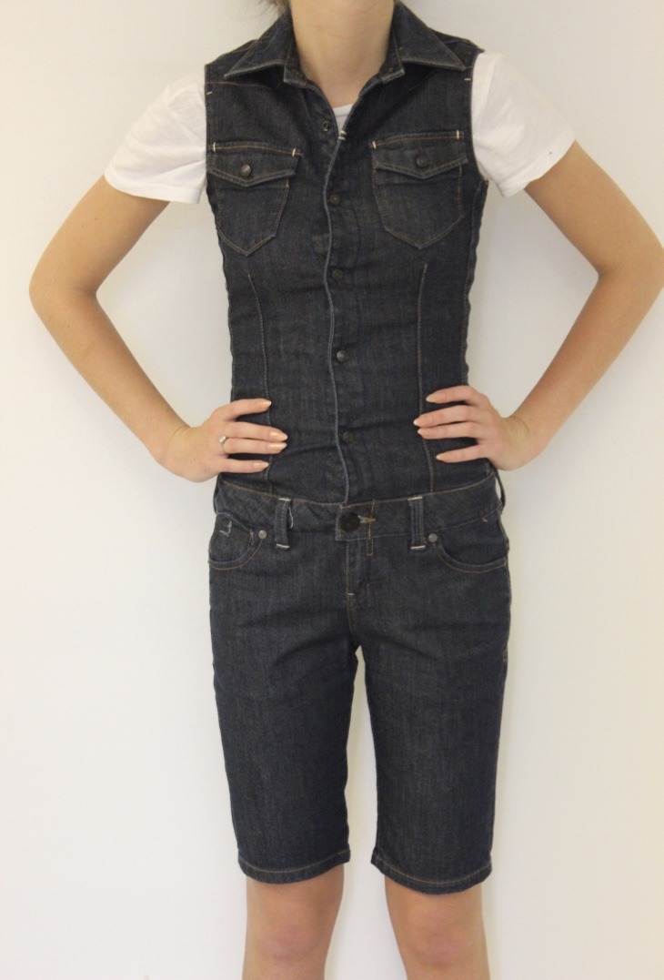 2012001 - Korte donkerblauwe tuinbroek (jeans) van G-star in maat XS (valt als confectiemaat 32/34). De tuinbroek sluit met knopen en een rits aan de voorzijde en er kan een riem om gedragen worden.