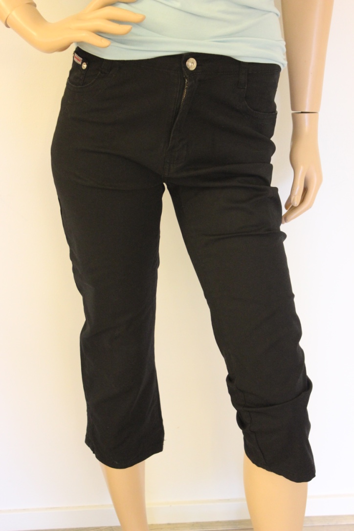 2014002 - 3/4 zwarte broek van Swallow Jeans in maat 38. De broek sluit met een rits en een knoop voor, heeft twee insteekzakken voor, twee achterzakken en bling bling steentjes op de achterzak en een paar voor bij de boord van de zak. De broek heeft stretch.Stof: 95% katoen, 5% fibras (het is geen jeansstof)