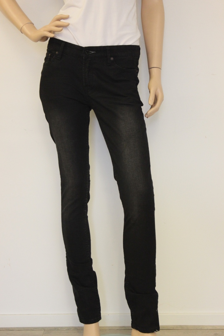2010020 - Zwarte skinny jeans van Denham in maat 29/32. De jeans is op de bovenbenen iets lichter gemaakt. De jeans sluit met een rits en een knoop voor, heeft twee insteekzakken voor en twee achterzakken.Het model heet: Cleaner Regular Fit