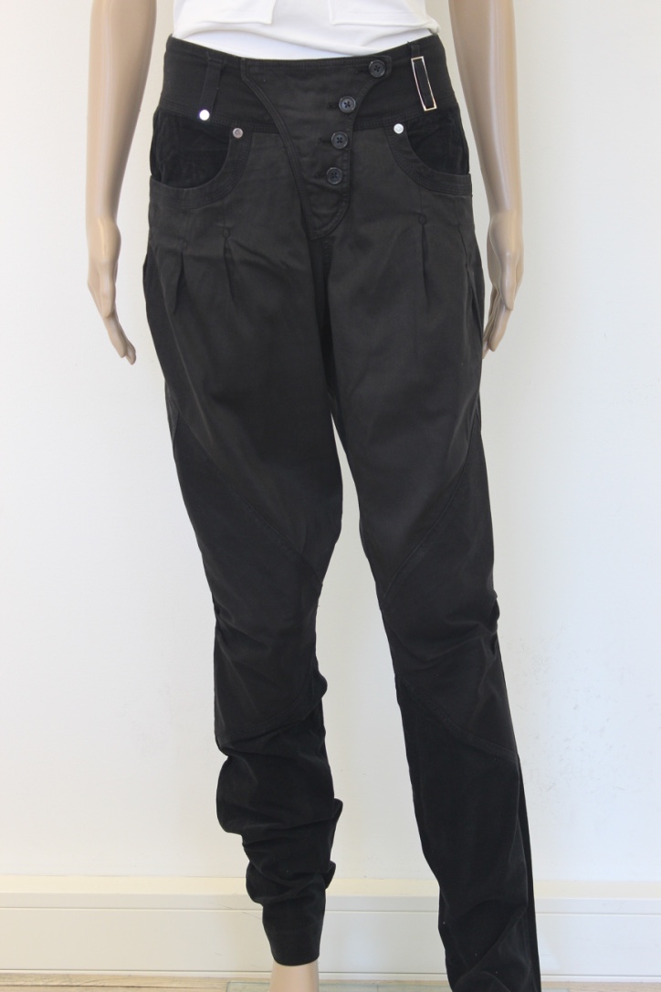 2010013 - Zwarte broek van High in maat 42. De broek sluit met een rits en knopen voor, heeft twee insteekzakken voor, twee achterzakken en een elastische taille. Om de broek kan een riem gedragen worden. De broek is gemaakt van twee soorten stof: 1) gladde zwarte stof, 2) zwarte stof met een hele fijne rib.Stof 1: 66% lyocell, 32% katoen, 2% elasthaan.