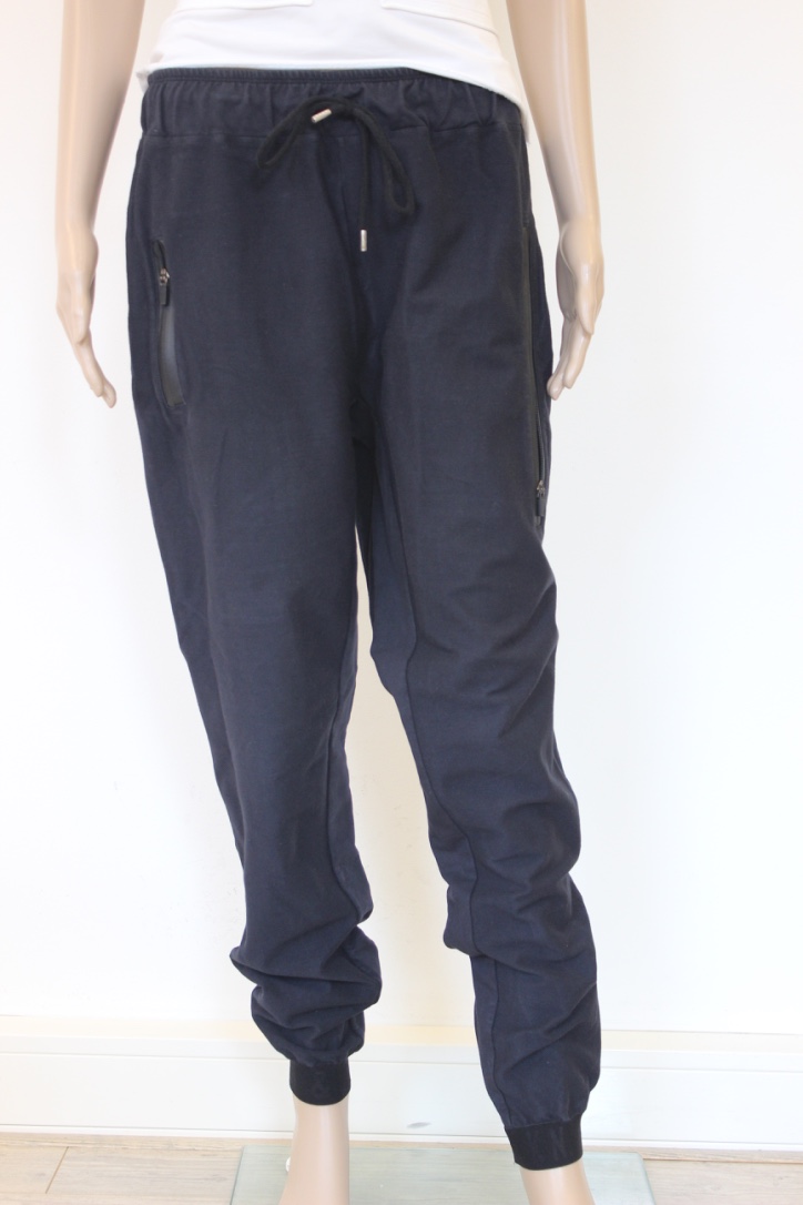 2010013 - Donkerblauwe broek van Penn & Ink in maat XL (maat 42). De broek heeft twee insteekzakken met ritsjes, een elastische taille en een nep achterzakje. De boorden van de pijpen zijn elastisch.