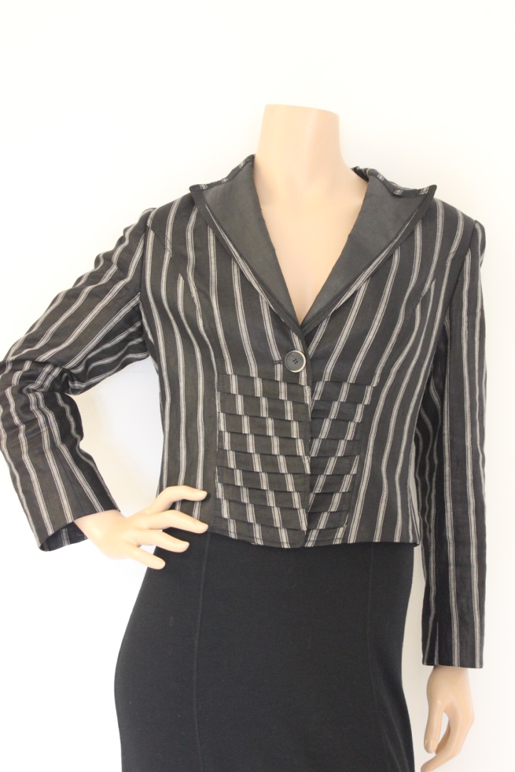 2012013 - Zwart/wit linnen jasje van Mart Visser in maat 40. Het jasje is geheel gevoerd en sluit met een knoop aan de voorzijde. Stof: 100% linnen.