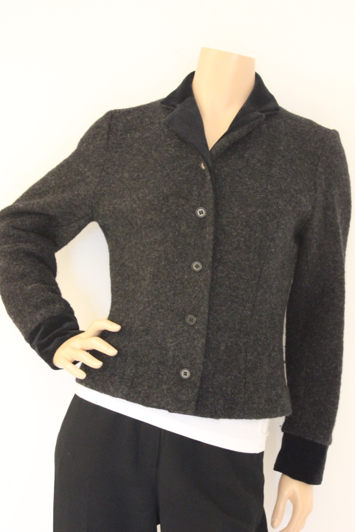 2016005 - Zwart/antraciet wollen jasje van Far Hills in maat 36. Het jasje is niet gevoerd en sluit met knopen aan de voorzijde.