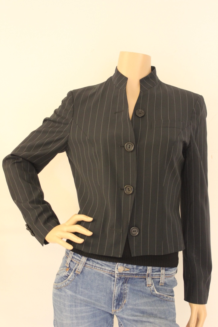 2016005 - Zwart krijtstreep dun wollen jasje van Josephine & Co in maat 38. Het jasje is geheel gevoerd en sluit met knopen aan de voorzijde.
