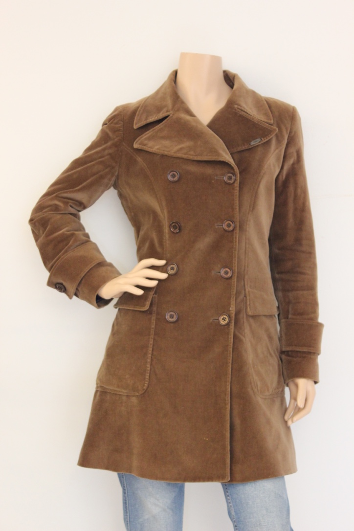 2014002 - Lichtbruine velours jas van Nemo in Italiaanse maat 44 (Nederlandse maat 38). De jas is geheel gevoerd, sluit met knopen en heeft twee opgestikte zakken voor.