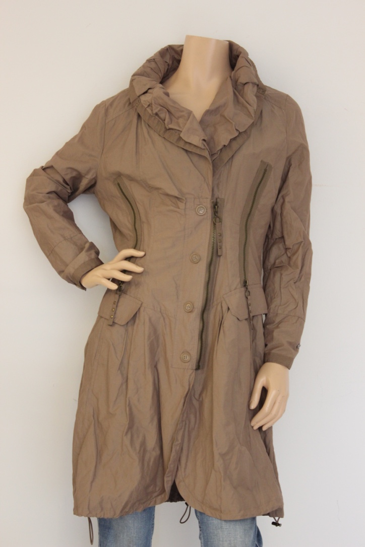 2014002 - Bruine zomerjas in maat 38. De jas sluit met knopen en een rits voor en is geheel gevoerd. De jas heeft een binnenzak en twee insteekzakken voor. Door het metaal in de stof krijgt de jas een beetje een bof- en kreukeffect.