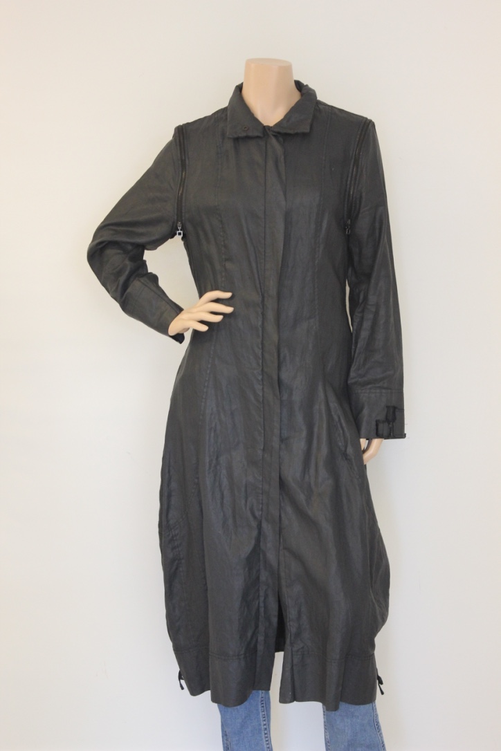 2014002 - Zwarte lange zomerjas van Sarah Pacini in maat 2 (maat 38). De jas sluit met een rits aan de voorkant en is niet gevoerd. De stof heeft een beetje een gewaste look. De mouwen zijn afritsbaar.
