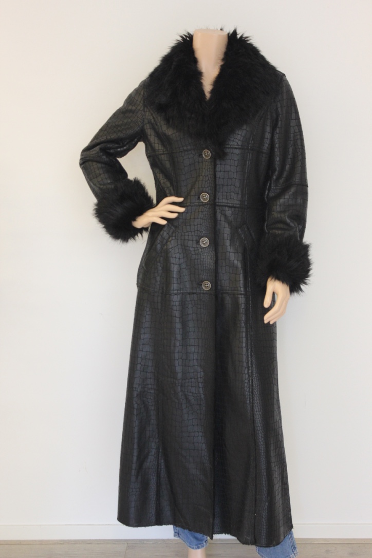 2014002 - Zwarte lange leatherlook jas van Bandolera in maat 38. De jas is geheel gevoerd met zachte stof, heeft twee insteekzakken voor en sluit met knopen.