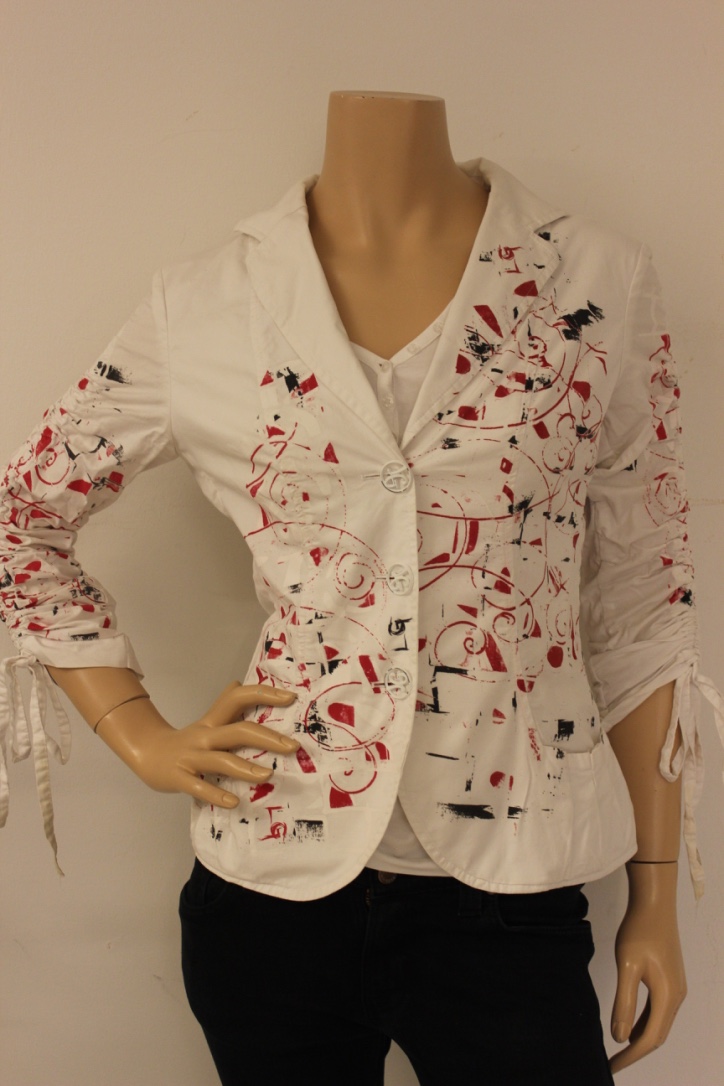2010026 - Roomwit/rood/zwart jasje van Legatte in maat 38. Het jasje is niet gevoerd. De mouwtjes hebben koordjes waardoor een pofeffect ontstaat.