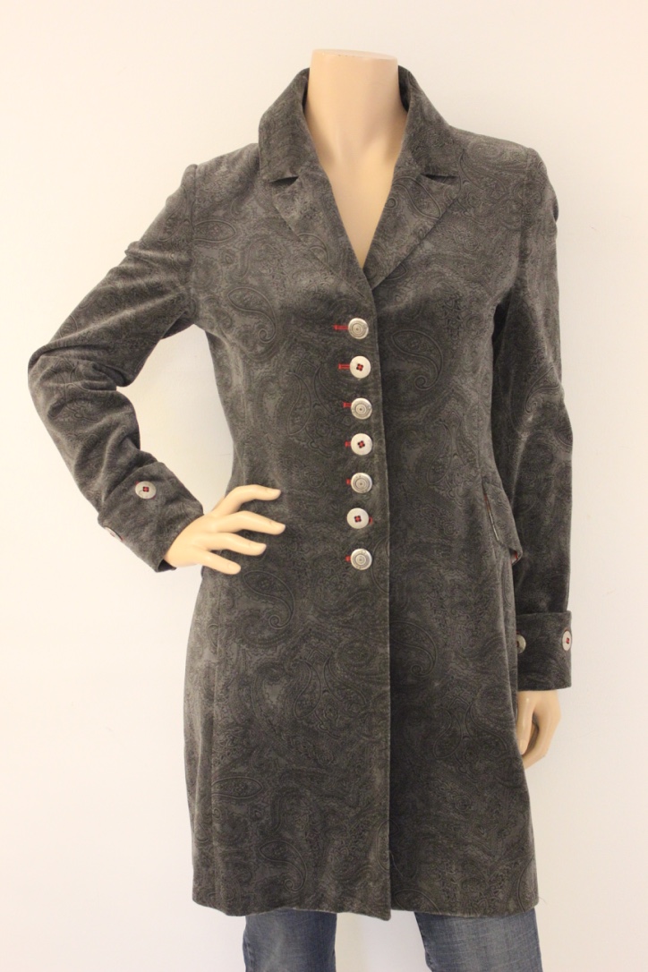 2010005 - Grijze lange velours jas van NAN in maat 38. De jas is geheel gevoerd en sluit met knopen aan de voorzijde. De jas heeft twee insteekzakjes voor die nog dichtgenaaid zijn.