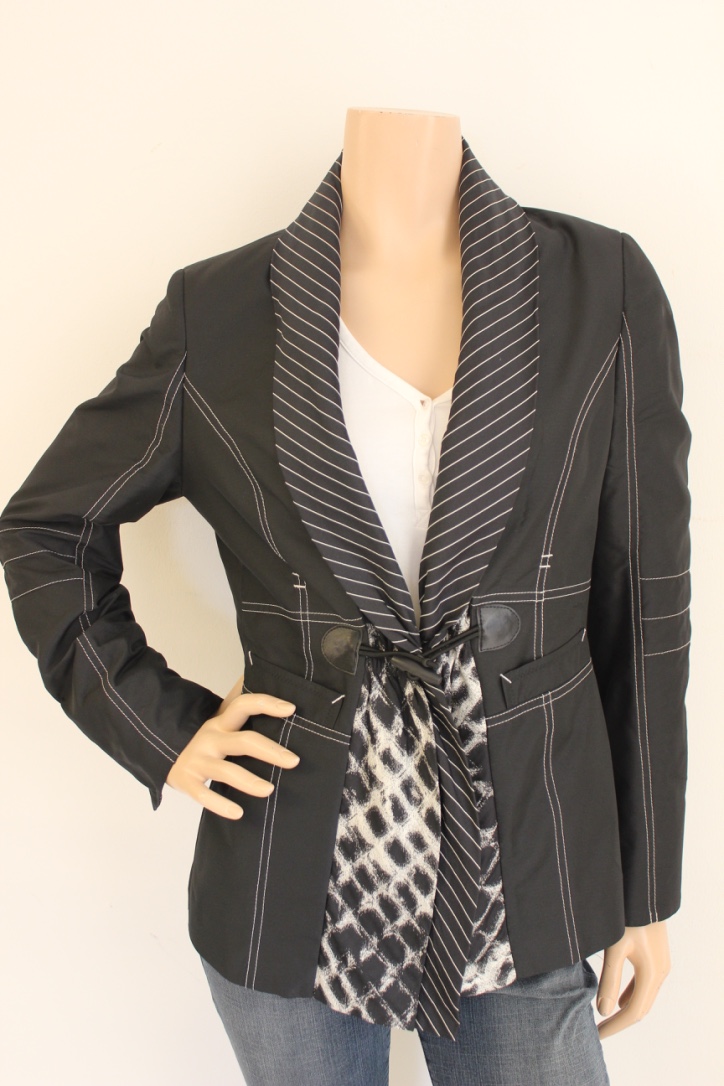 2010020 - Zwart/roomwit jasje van Mart Visser in maat 40. Het jasje is geheel gevoerd, heeft twee insteekzakken en een -'houtje-touwtje-sluiting' voor.