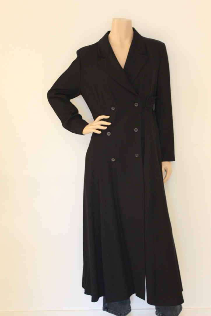2010020 - Donkerblauwe lange jas van Joseph Janard in maat 40. De jas is geheel gevoerd en is double breasted. De jas is gemaakt van dunne wol (goed geschikt voor lente en herfst). De jas is 130 cm lang vanaf onder de kraag over het rugpand gemeten.