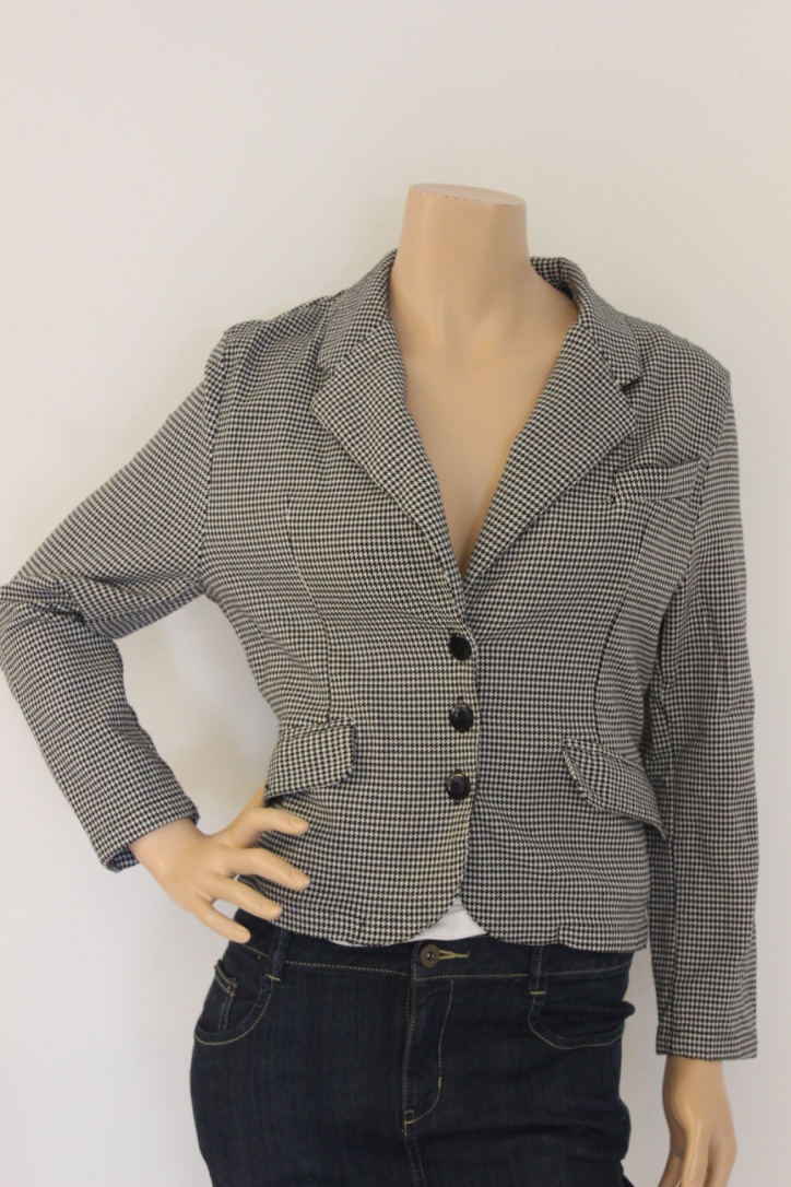 2013001 - Zwart/wit jasje van Expresso in maat M (valt als maat 38). Het jasje is niet gevoerd en sluit met knopen aan de voorzijde. Het jasje heeft stretch en twee insteekzakjes voor.