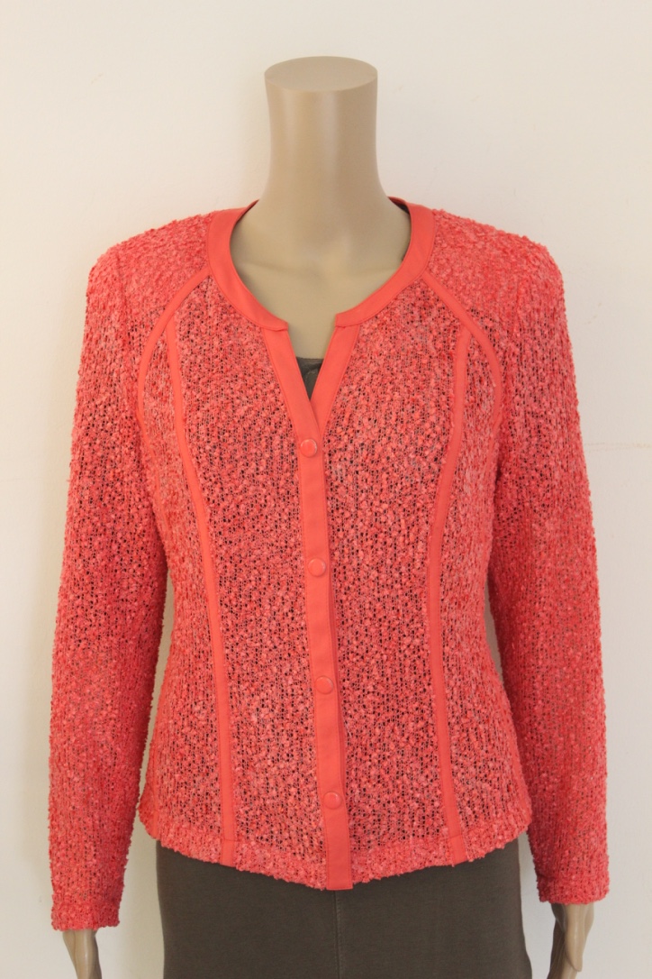 2011008 - Roze doorschijnend jasje van Frank Walder in maat 42. Het jasje sluit met drukknoopjes en heeft schoudervullingen (deze kunnen eventueel verwijderd worden).