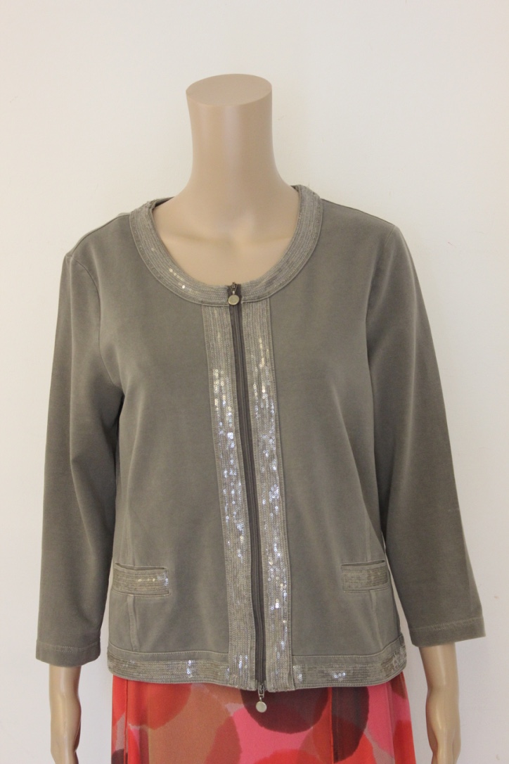 2012013 - Gerry Weber grijs vestjasje maat 40. Het jasje heeft pailletjes op de revers waardoor het een beetje een glinstereffect krijgt en sluit met een rits aan de voorkant.