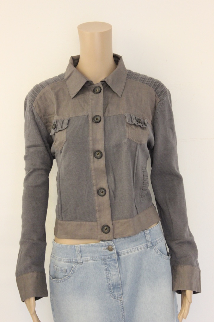 2012006 - Grijs kort jasje van Uno Due in maat 46. Het jasje is niet gevoerd en sluit met knopen aan de voorzijde. Stof: 100% katoen.