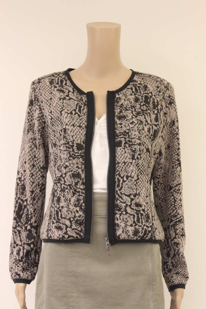 2012013 - Rozes of Avalon beige/zwart jasje. Het voor en achterpand van het jasje is gevoerd met zwarte t-shirt stof. Het jasje sluit met een rits aan de voorkant en is ook te koop in combinatie met een jurkje en/of sjaaltje. Zoek via de zoekmachine op 'Rozes of Avalon' om de combinaties te vinden. Stof: 52% katoen, 46% polyester, 2% elasthaan.