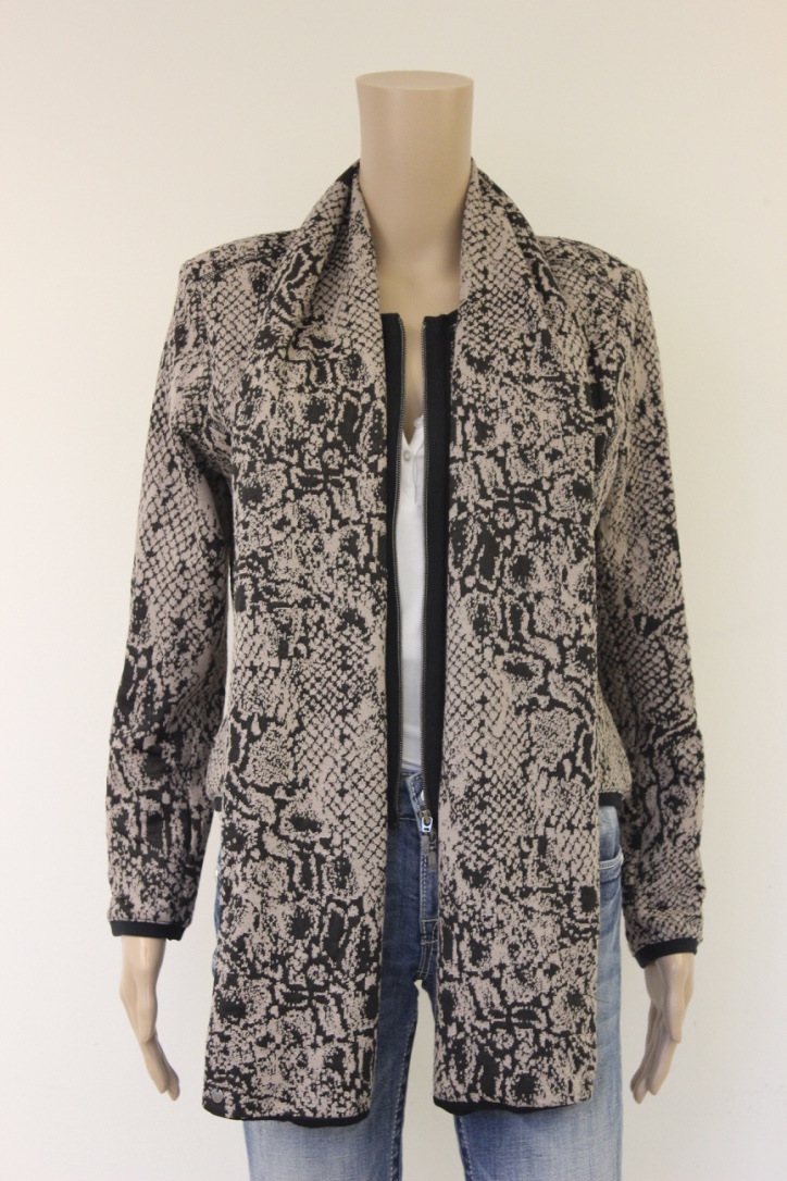 2012013 - Set van Rozes of Avalon beige/zwart jasje en sjaaltje. Het voor en achterpand van het jasje is gevoerd met zwarte t-shirt stof. Het jasje sluit met een rits aan de voorkant en is ook te koop in combinatie met een jurkje en/of sjaaltje. Zoek via de zoekmachine op 'Rozes of Avalon' om de combinaties te vinden.