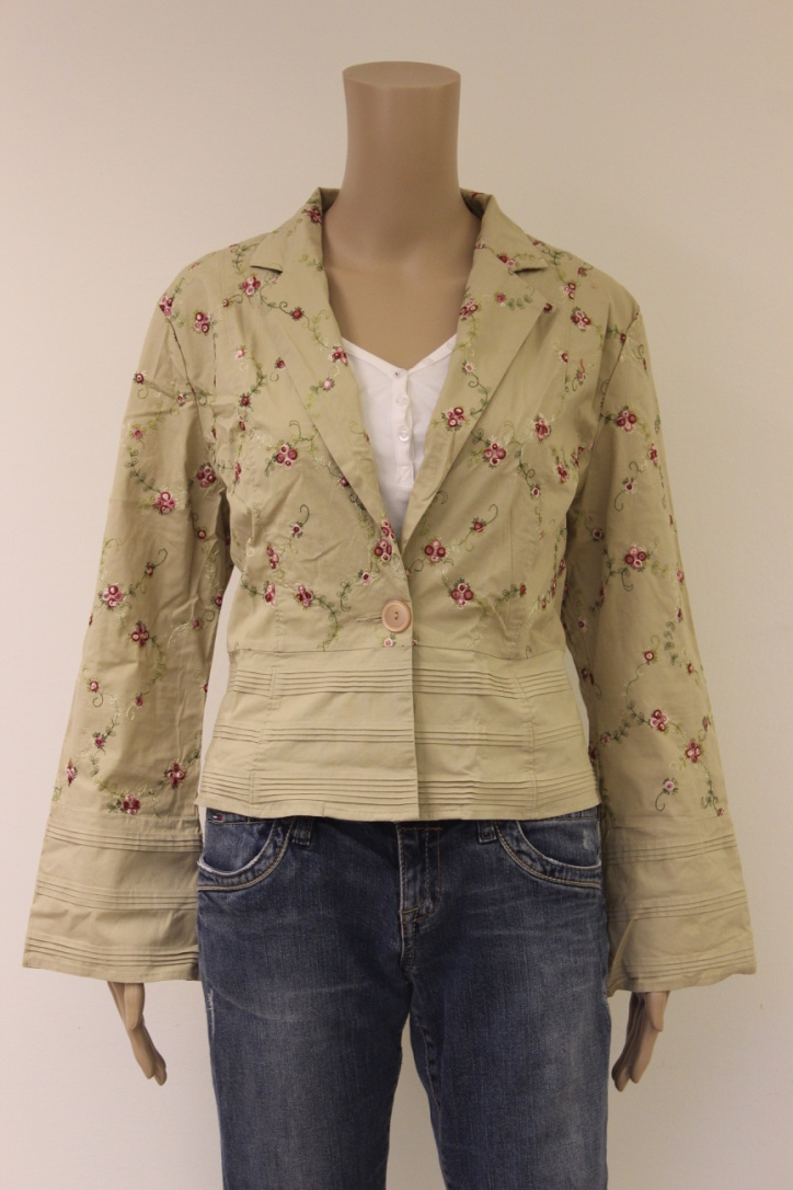 2012006 - Beige gebloemd jasje van The Barn in maat 44. Het jasje is niet gevoerd en sluit met één knoop.Stof: 97% katoen, 3% elasthaan.