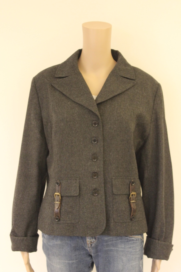 2015004 - Grijs jasje van Greenwood in maat 44. Het jasje is geheel gevoerd en heeft twee zakjes met leren riempjes (zitten nog dichtgenaaid).