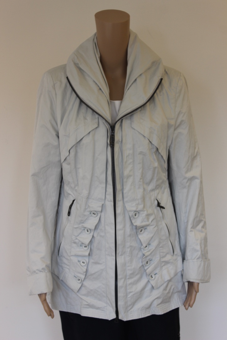 2012013 - Lichtgrijze tussenjas (herfst en lente) van Creenstone in maat 42. De jas sluit met een rits, heeft een capuchon verstopt in de kraag, twee insteekzakken met rits en een rits die aan twee kanten open kan. Door het metaal in de stof krijgt de jas een beetje een kreukeffect.Stof: 51% polyester, 43% katoen, 5% metaal.