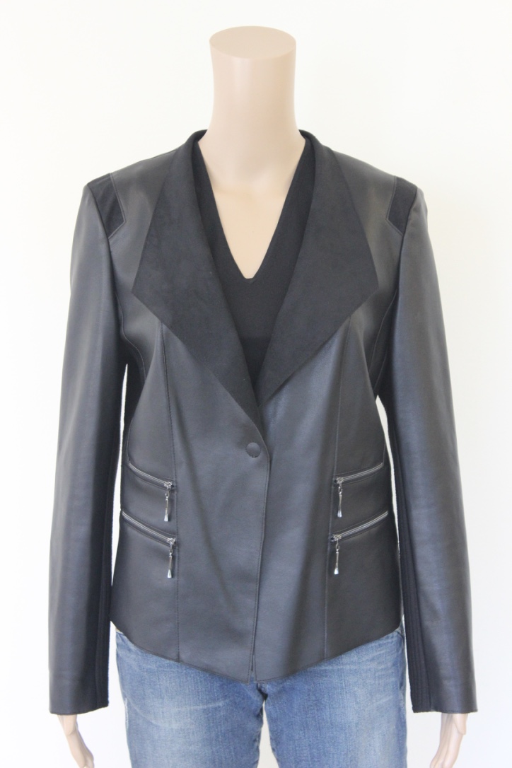 2012013 - Zwart nepleren jasje van Barbara Lebek in maat 38. Het jasje valt soepel en is gemaakt van twee soorten stof: nepleer en ee strook elastische stof in de taille en onderaan de mouwen. Het jasje sluit met een drukknoop en heeft vier nepzakjes met rits voor. Stof 1: 60% polyurethaan, 40% polyester.