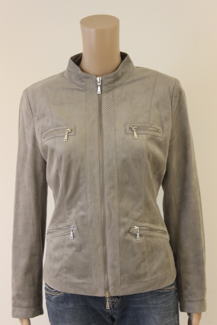 2012013 - Grijs nepsuede jasje van Rabe in maat 40. Het jasje is geheel gevoerd. Het jasje heeft twee nepborstzakjes met rits en twee insteekzakjes met rits.