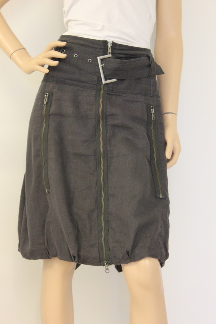 2012006 - Donkerbruine linnen rok van Anna van Toor in maat 46. De rok heeft drie (sier)ritsen aan de voorkant een split aan de achterkant. In de boord zit een beetje elastiek, waardoor de rok een leuk pofeffect krijgt. De rok is gevoerd met een dun voeringsstofje. Stof: 100% linnen.