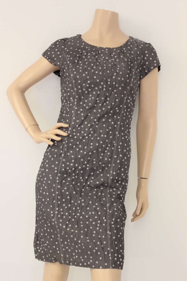 2011008 - Grijze jurk met lichtgrijze stippen van Gerry Weber in maat 36/38. De jurk sluit met een rits aan de achterkant. Door het metaal in de stof heeft de jurk een beetje een kreukeffect. De jurk is geheel gevoerd.