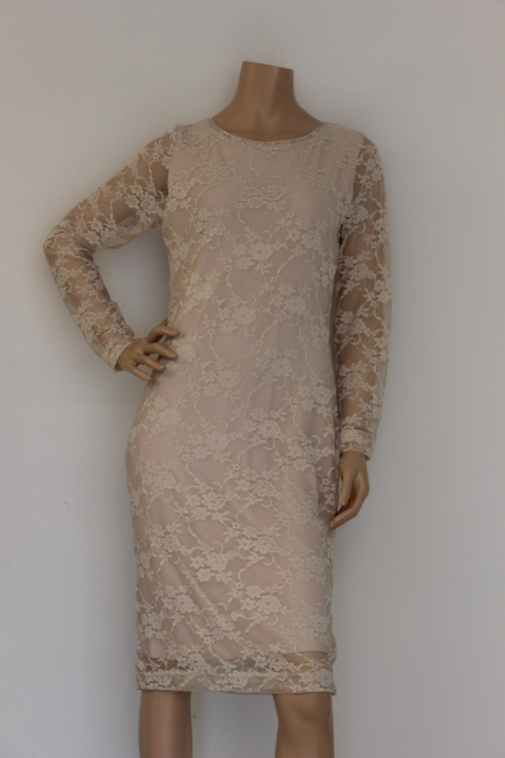 2016006 - Lichtroze jurk van Roses of Avalon in maat L/maat 42 (de jurk valt echter als maat 40/42). De jurk is dubbellaags: een kanten elastische bovenlaag en een effen t-shirtstof onderlaag. De mouwen zijn enkellaags evenals het onderste stukje van de jurk.