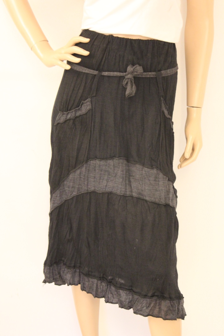 2014002 - Zwart grijze rok in maat 36. De rok heeft een elastische taille en heeft een koordje om de heup. Stof: 95% polyester, 5% elasthaan.