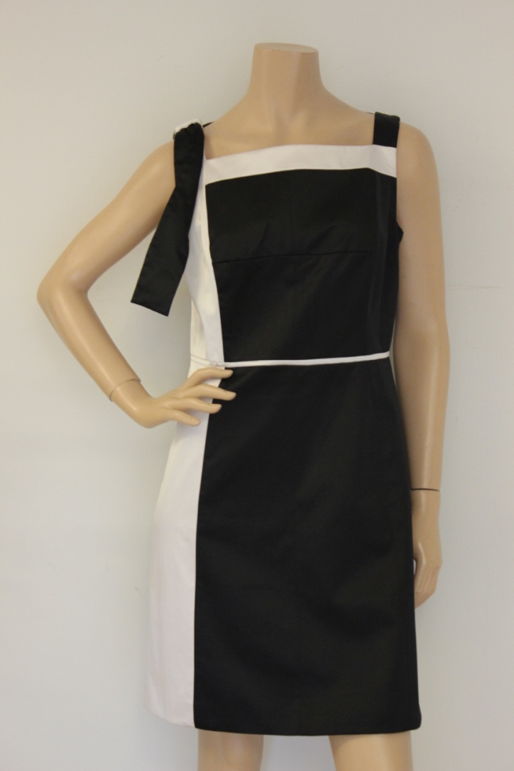 2016009 - Zwart/wit jurkje van Karen Millen in maat 42. Het jurkje is gemaakt van gladde stof, is geheel gevoerd en sluit met een rits aan de achterkant.