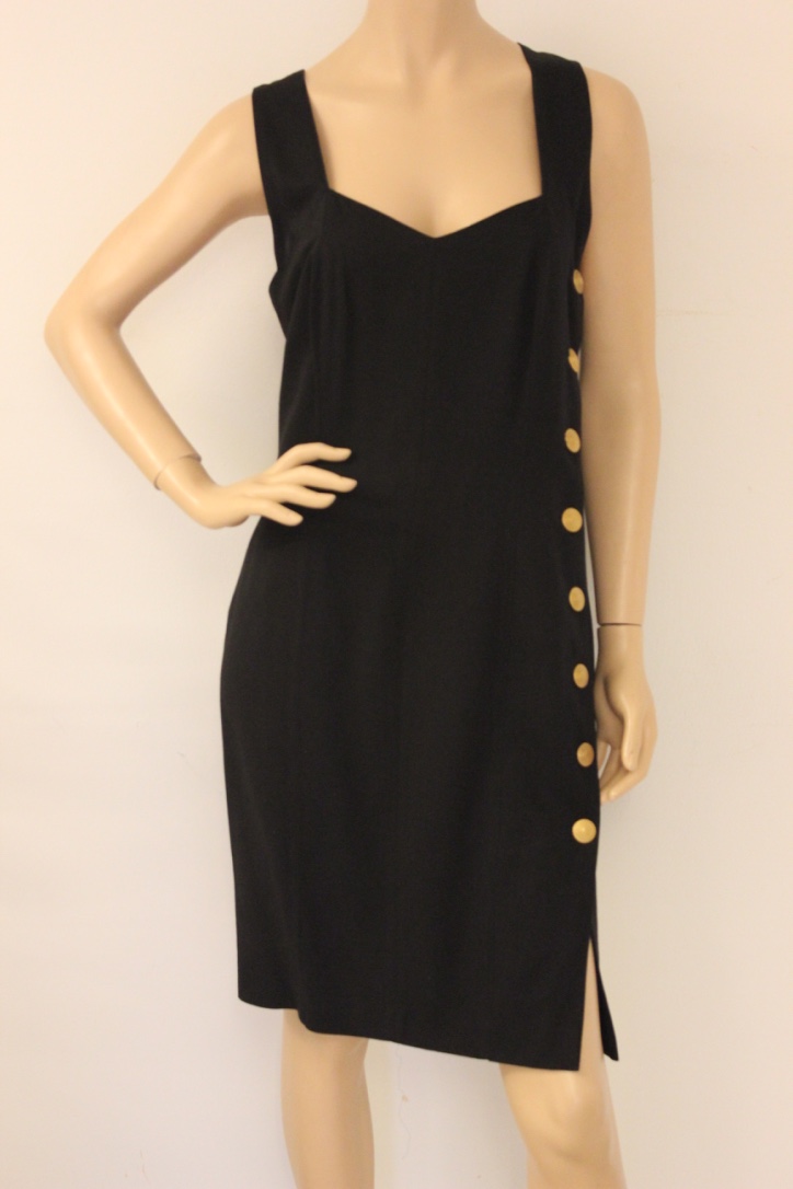 2010020 - Zwart jurkje met gouden knopen van Mondi in maat 42. Het jurkje is geheel gevoerd. De bandjes lopen kruislings op de rug. Stof: 85% viscose, 15% zijde.