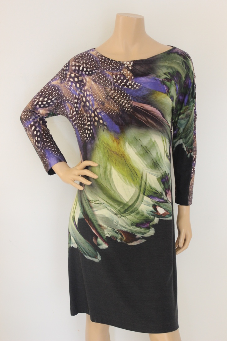 2012013 - Bonte jurk van Jean Paul in maat 40. De print bevat pauwenveren.Stof: 97% viscose, 3% elasthaan.