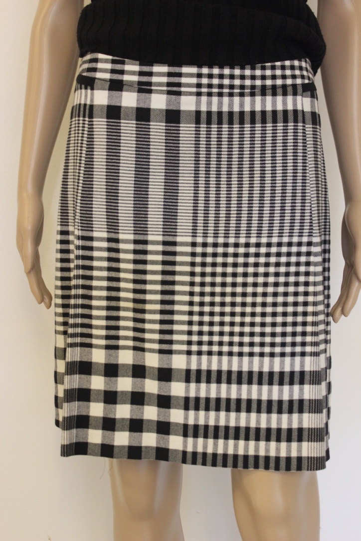 2007001 - Zwart/witte rok van Apriori in maat 40. De rok is geheel gevoerd en sluit met een rits aan de zijkant. De rok heeft twee plooien voor, waardoor het een beetje op een plooienrok lijkt.
