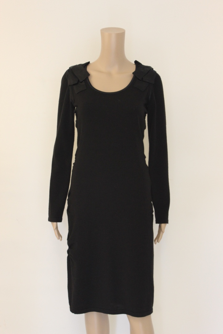 2017001 - Zwarte jurk van Steffen Schraut in maat 38 met zijden stukjes stof op de schouder. De jurk is geheel gevoerd, heeft plooien op de heup en sluit met een rits aan de achterzijde.