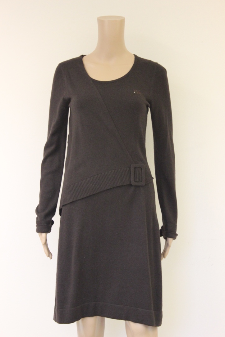 2013006 - Bruin jurkje van River Woods in maat S (maat 36). Het jurkje heeft een overslag met (nep)ceintuur.Stof: 60% viscose, 22% wol, 15% nylon, 3% cashmere.