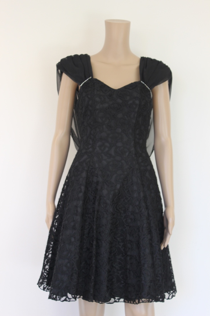 2017005 - Zwart cocktailjurkje van Valentina in maat 34/36. Het jurkje heeft baleinen bij de borst, sluit met een rits aan de achterkant en de rok is drie dubbellaags (de onderste laag is tule). Om de schouders zit een sjaal vast die los of achter geknoopt kan worden gedragen. Meer foto's op verzoek verkrijgbaar.