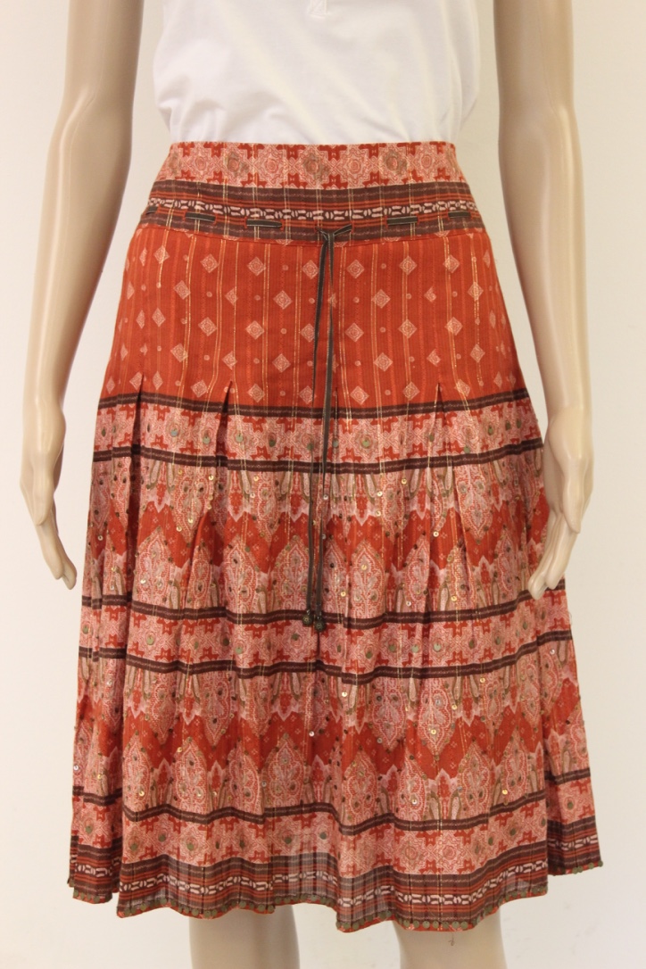 2010030 - Bruinrode rok van Massimo Dutti in maat 38/28 (valt als maat 36/38). Het rokje sluit met een rits aan de zijkant. Op het rokje zitten pailletjes genaaid die het rokje een glinstereffect geven.