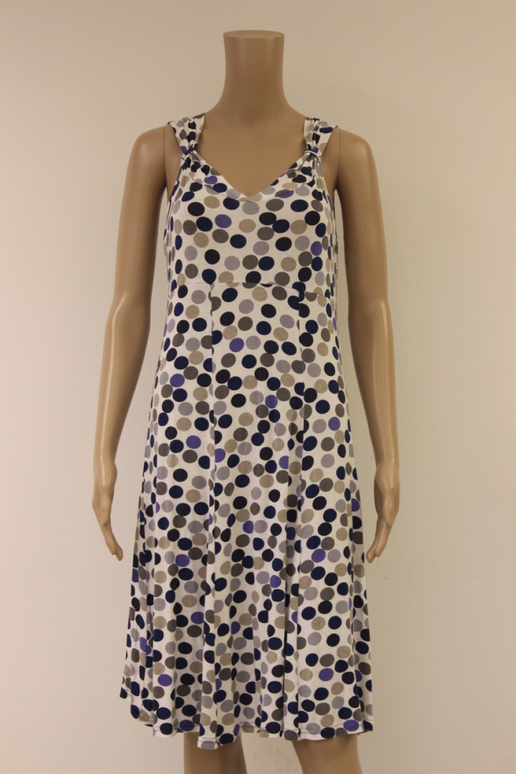 2013006 - Witte zomerjurk met blauwe, grijze en beige stippen in maat M (valt als maat 36).Stof: 94% viscose, 6% elasthaan.