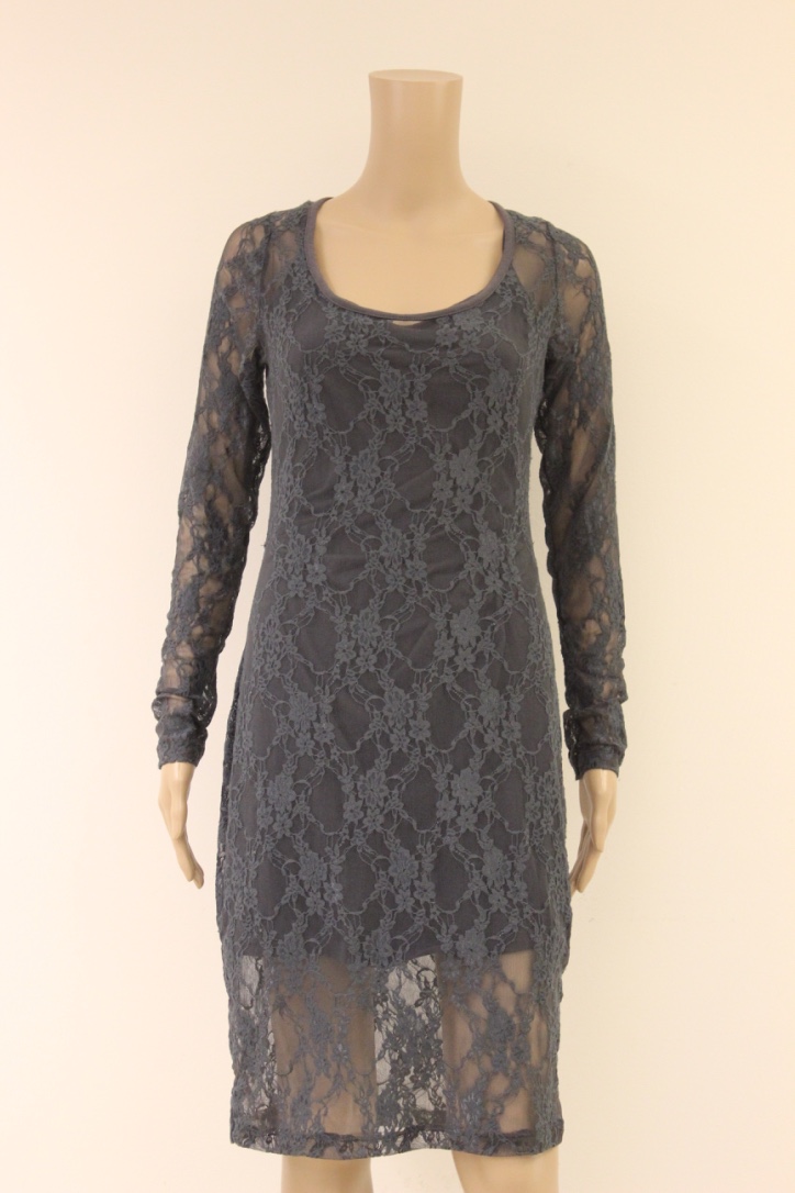 2013006 - Blauwe kanten jurk in maat 38. De jurk is dubbellaags: een onderjurkje van t-shirtstof met een bovenlaag van kant. Stof: 92% katoen, 8% elasthaan.