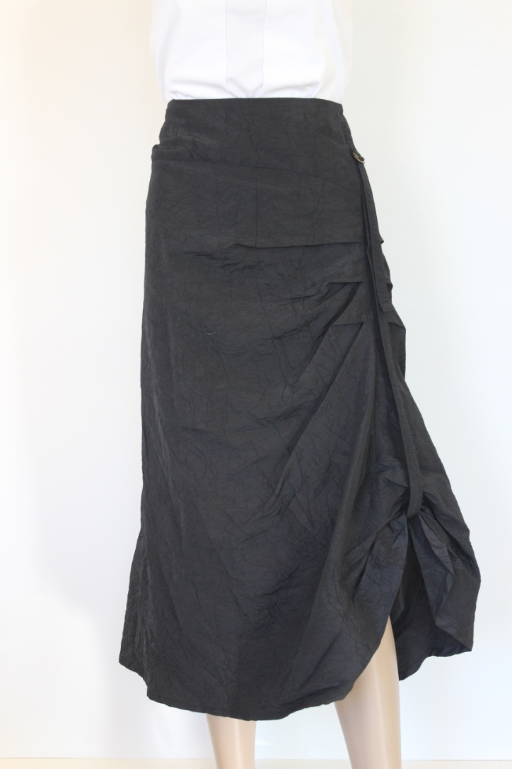 2015004 - Zwarte feestelijke rok van SUB.R in maat 46. De rok is geheel gevoerd en heeft een geplooide zijkant. De split kan met het riempje hoger of lager gemaakt worden. De stof heeft een kreuk-look.