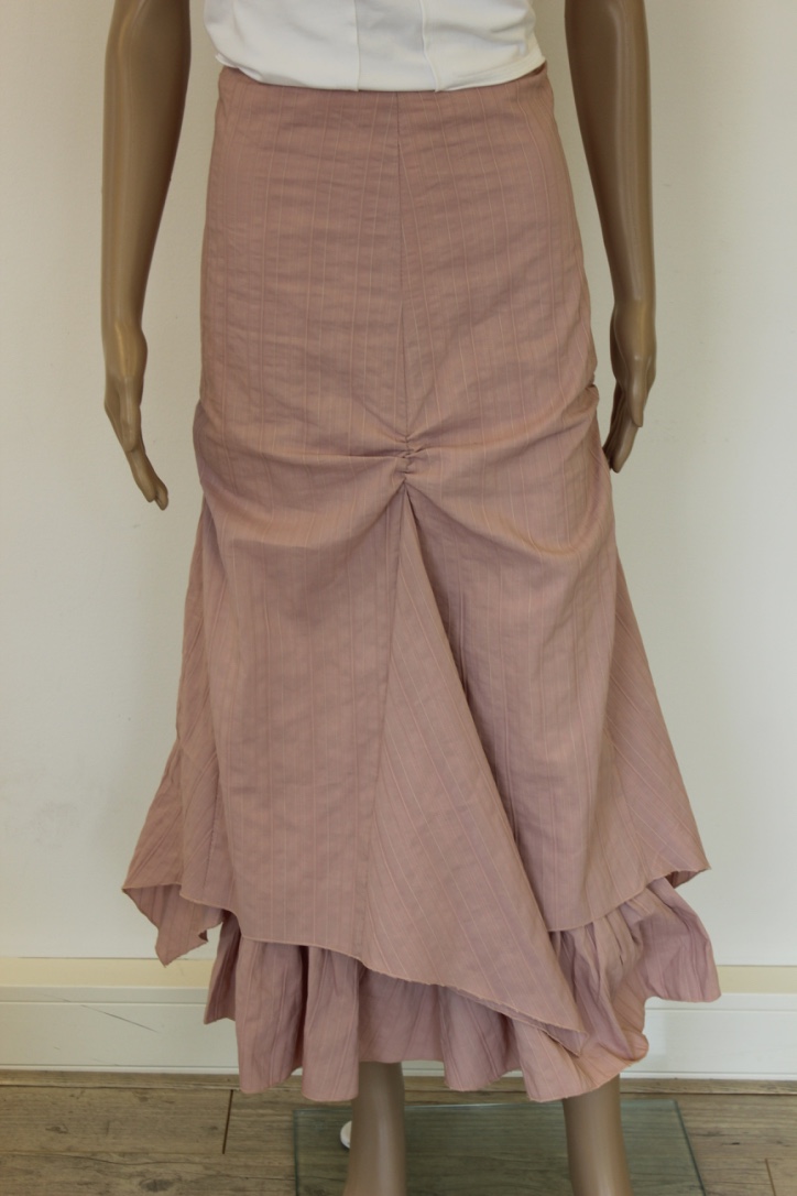 2017003 - Lange roze feestelijke rok in maat 34. De rok is geheel gevoerd en sluit met een rits. Taillemaat: 33 cm.