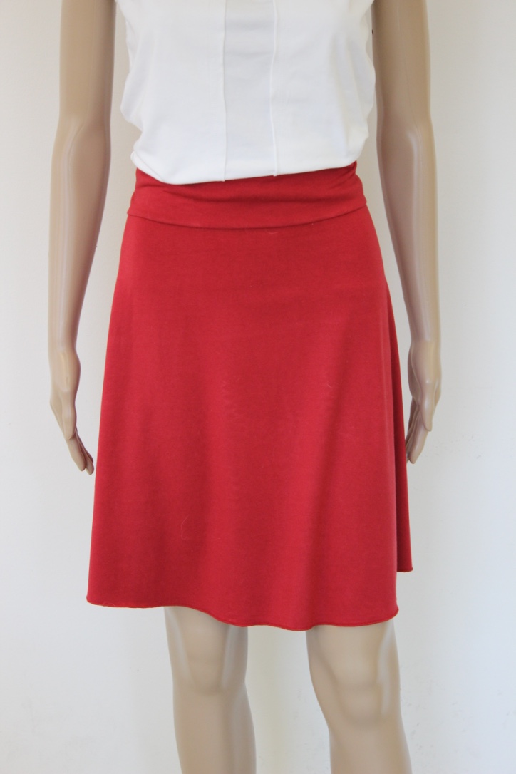 2010002 - Rood zwangerschapsrokje van Queen Mum in maat S. Het rokje heeft een elastische taille en is gemaakt van dikke t-shirtstof.Stof: 94% viscose, 6% elasthaan.