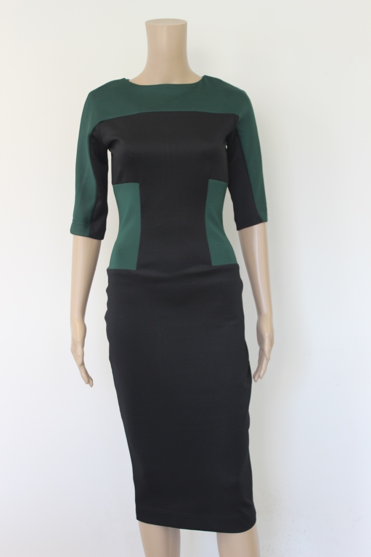 2012012 - Groen/zwarte strakke jurk van Nikkie in maat 38. De jurk sluit met een rits aan de achterkant. Stof: 94% polyester, 6% elasthaan.