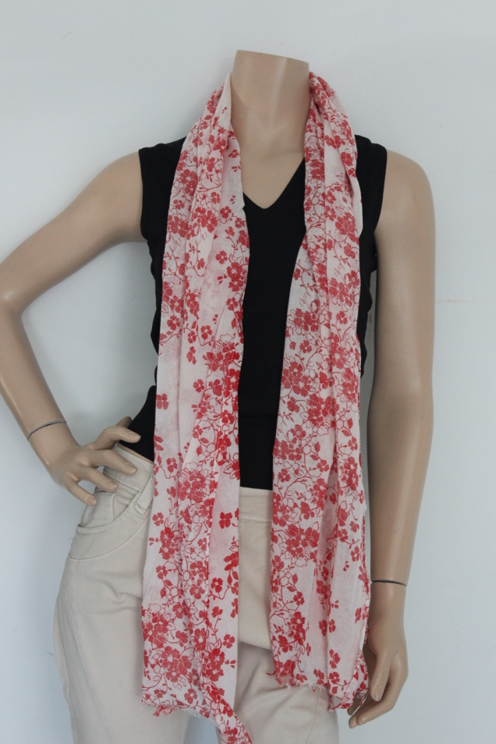 2016003 - Rood/wit gebloemde sjaal van linnen-achtige stof.