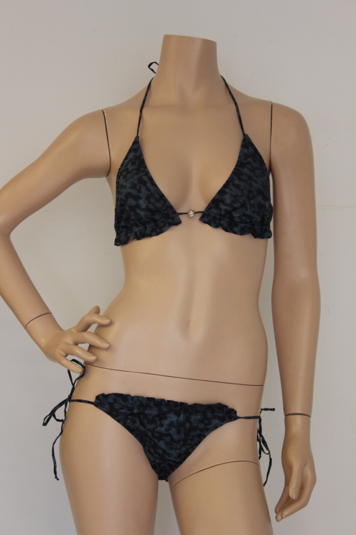 2013001 - NIEUWE Zwart/grijsblauwe bikini van Ponchobikini in maat 34. Het broekje sluit met twee koordjes aan de zijkant. De bikini sluit met een koordje op de rug en een koordje in de hals.