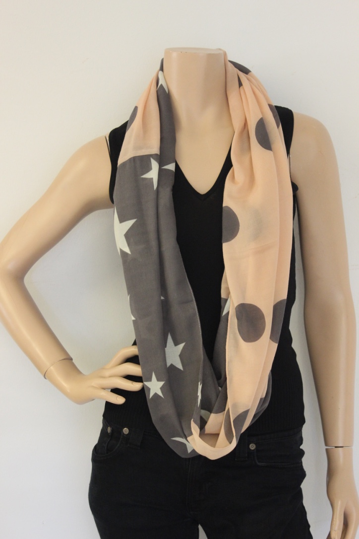 2014001 - Grijs/roze colsjaal met sterren.Stof: 100% polyester.