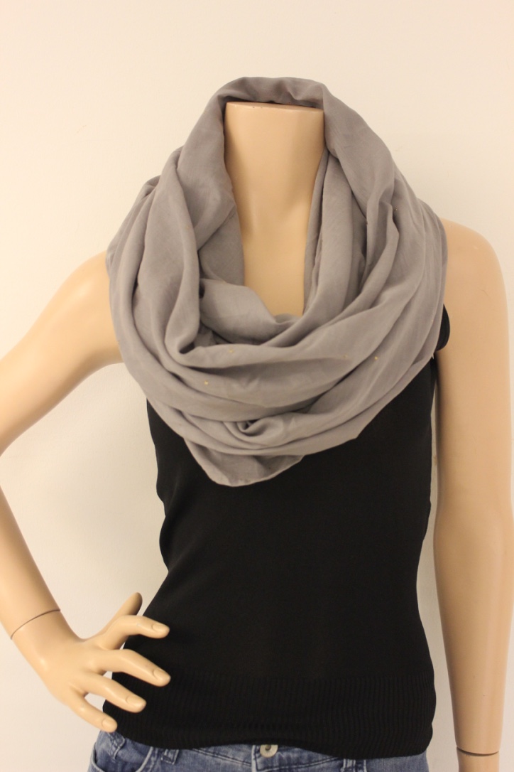 2014002 - Grijze sjaal met kleine goudkleurige blingbling steentjes. De sjaal loopt in een punt.